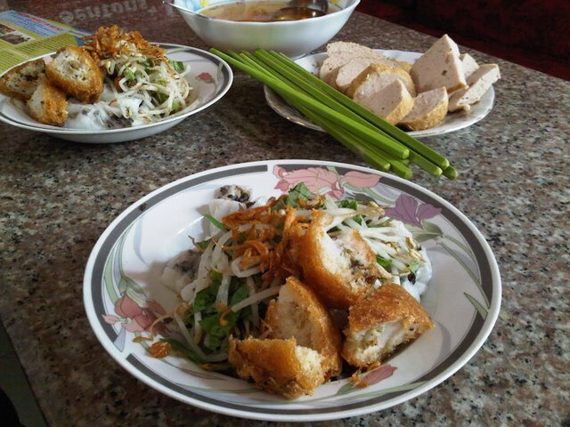 Avant de prendre l’avion de Ho Chi Minh vers Da Nang, petit déjeuner chez la famille de Thuy : Banh Cuon (crepes vietnamienne au porc) avec Nuoc Mam piments, Cha Lua (pâté viêtnamien), beignet de poisson frit, salade, pousses de soja et oignons frits. Un délice :)