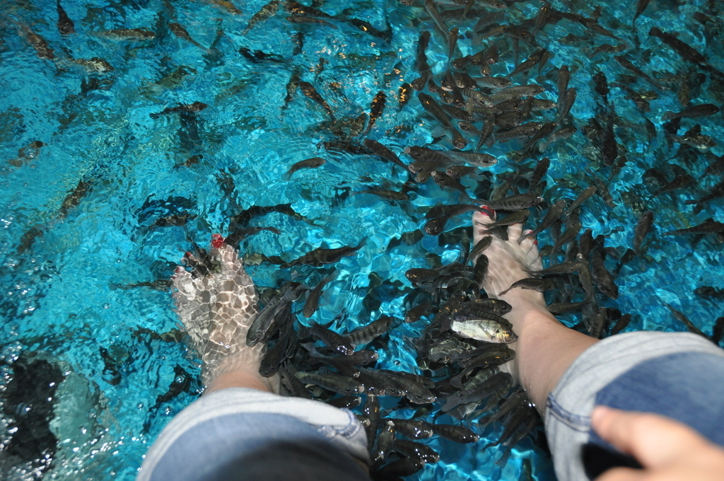 Thuy en a profité pour prendre soin de ses pieds en les plongeant 20 minutes parmi des…poissons !