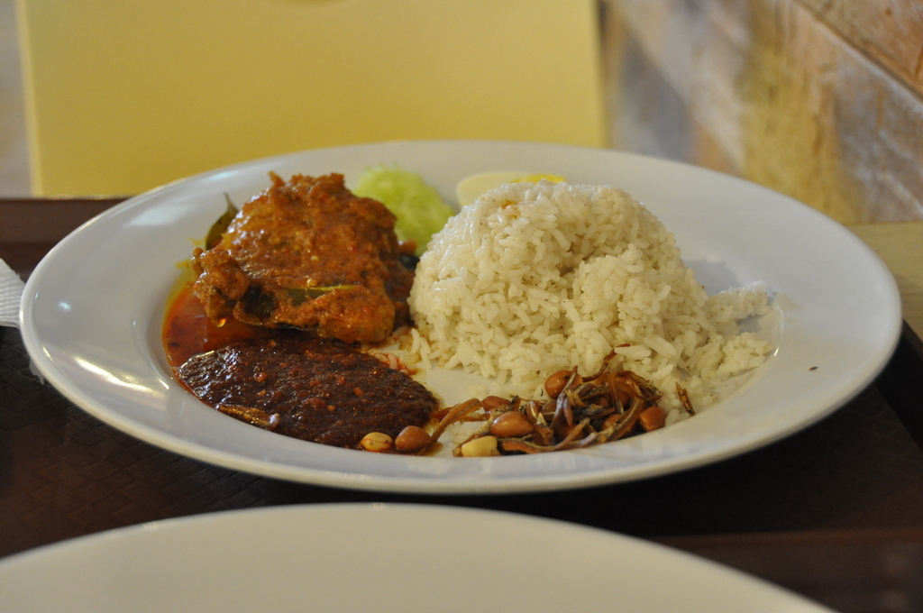 Il se compose d’un peu de riz (parfumé au lait de coco et aux épices), avec des anchois séchés et frits, quelques cacahuètes, des tranches de concombre, une sauce délicieuse à base de piments et un oeuf dur.