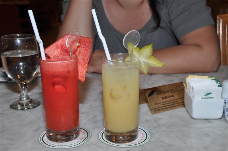Jus frais de pastèque et de carambole à l’hôtel en attendant la préparation de la chambre.