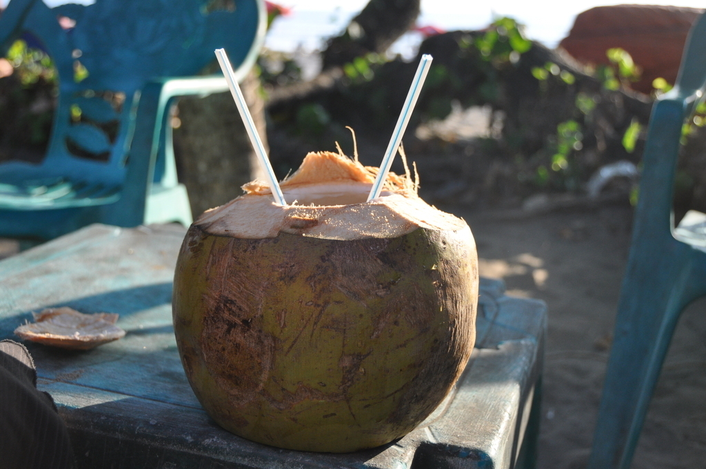 Nous rattrapons cette faute de goût en savourant le jus (et la pulpe) d’une jeune noix de coco le long de la plage.