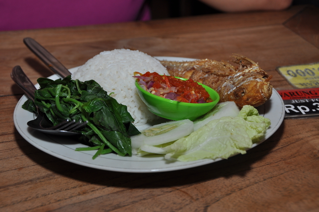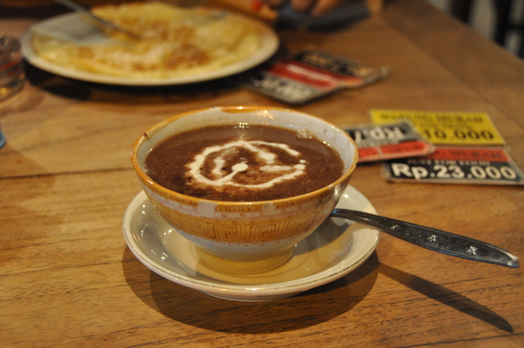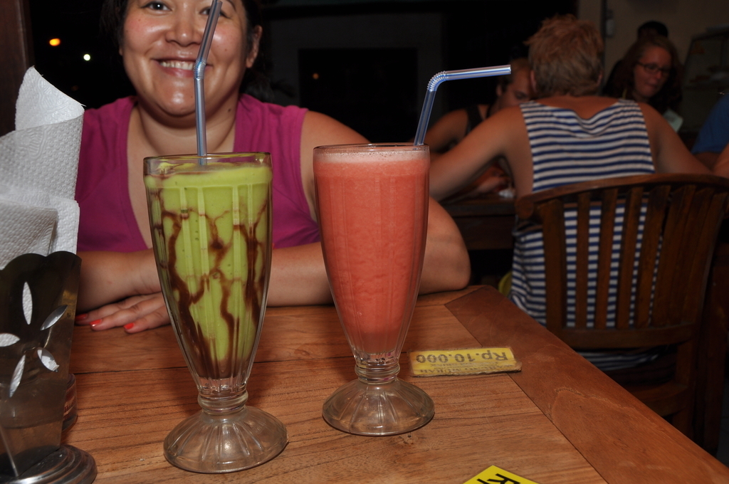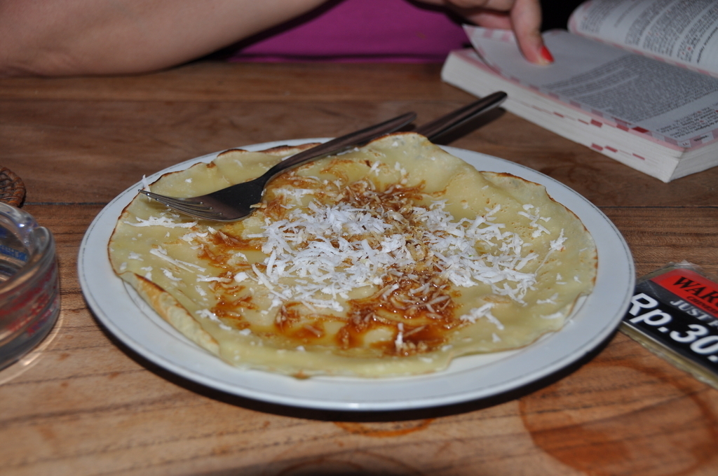 Au dîner, poisson frit pour Thuy et riz sauté à l’ananas pour moi. En boissons, jus de tomate et jus d’avocat (avec un soupçon de chocolat). En dessert, pancake à la noix de coco et sorte de porridge au riz noir et lait de coco.